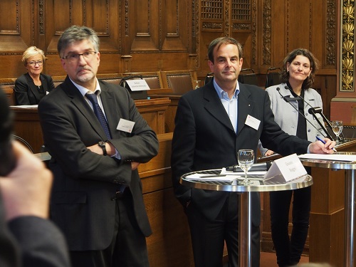 Referenten Biaggini und Pfister mit Moderatorin MdL Brigitte Lösch